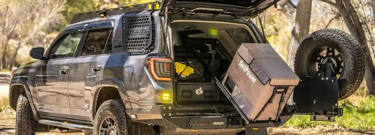 To keep his gear neat and secure, Jack opted for a Truck Vault drawer system in the rear cargo area in addition to a 2000W Renogy inverter, Rago molle panels, a Set Power fridge with tilt slide, as well as plenty of auxiliary red, amber, and white lighting.  One of the more prominent features of the rear of this vehicle would have to be the Dissent Off-Road bumper with rear swing out. This robust armor solution not only improves Jack’s departure angles, but also offers additional storage, features a integrated table, and relocates the spare tire from under the 2016 Toyota 4Runner in order to make room for the 24 gallon Long Range America fuel tank. To complete Jack’s armor package, he elected for RCI rock sliders which second as side steps.