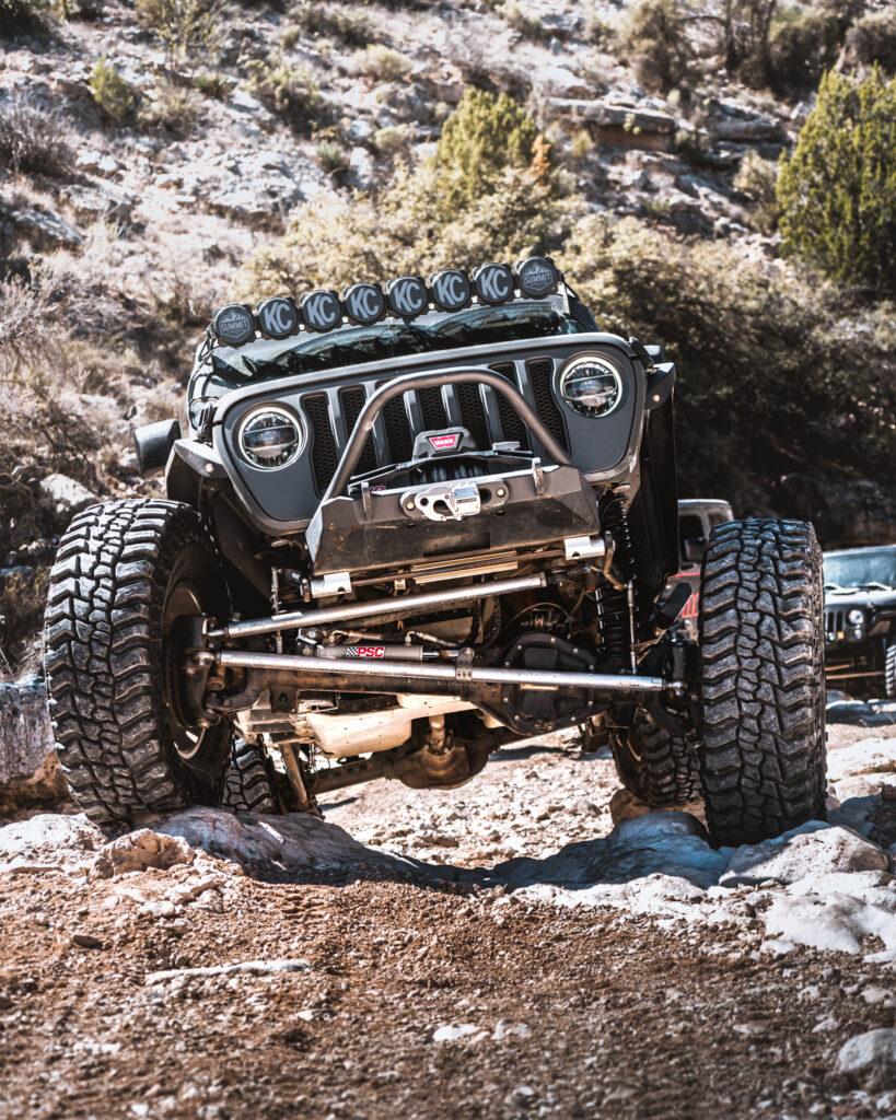 5.38 Revolution gears equipped with ARB pneumatic lockers provide similar functionality to a factory Rubicon while also improving low-end torque. A PSC hydraulic assist steering ram was necessary in order to turn these behemoth tires, which, paired with RPM steering linkage, provides a similar steering response to the factory.